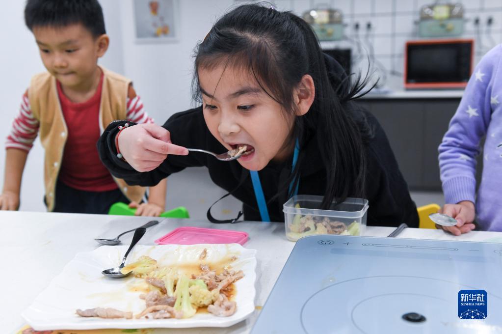 11月9日,在广东佛山顺德的西山小学“西山厨神培训中心”,学生品尝自己制作的肉丝炒花菜。新华社记者 毛思倩 摄