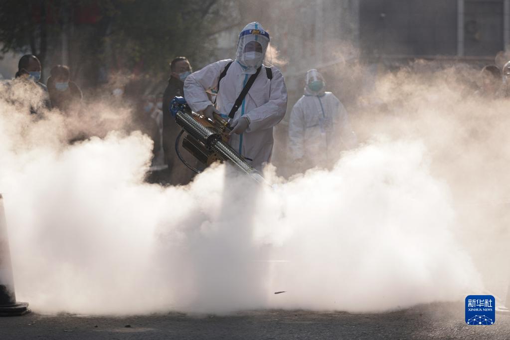 11月10日,在青海省西宁市城西区名都大厦采样点,工作人员对采样区域进行消杀。