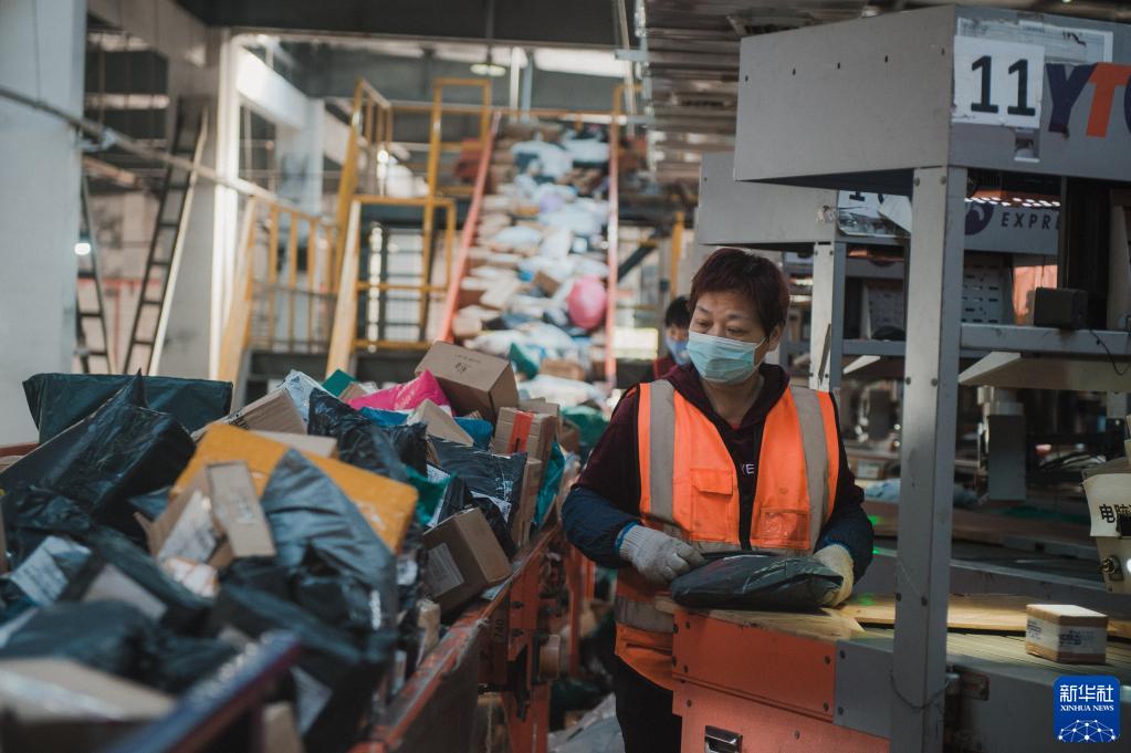 11月10日,在浙江省宁波市江北区的圆通速递宁波分拨中心,工人在自动分拣机前工作。