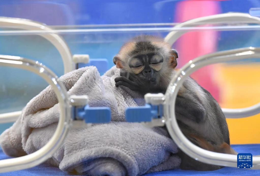 11月10日,人工繁育成功的黑腿白臀叶猴宝宝在广州长隆灵长类研究中心保育箱内休息。