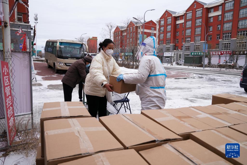 11月10日,在黑河市爱辉区一小区,社区工作人员(右)为居民发放免费生活物资。