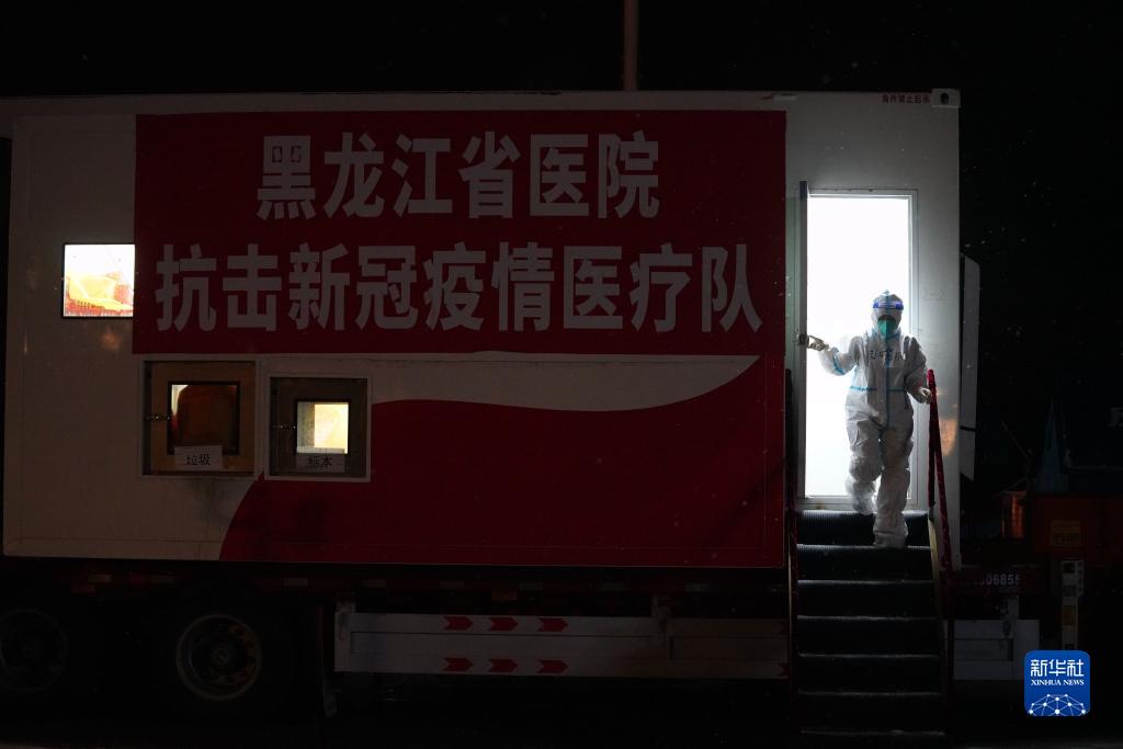 在黑河市爱辉区,黑龙江省医院医务人员走出“火眼”移动方舱实验室(11月9日摄)。