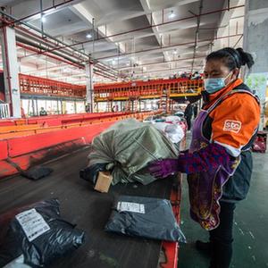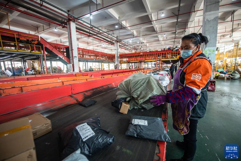 11月10日,工作人员在贵州快递物流园申通转运中心分拣快递。