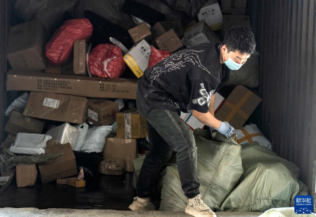 11月10日,工作人员在贵州快递物流园申通转运中心将已分拣的快递搬运装车。