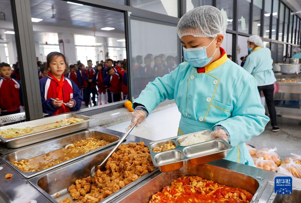 11月10日,红星小学学生在食堂窗口为同学分餐。