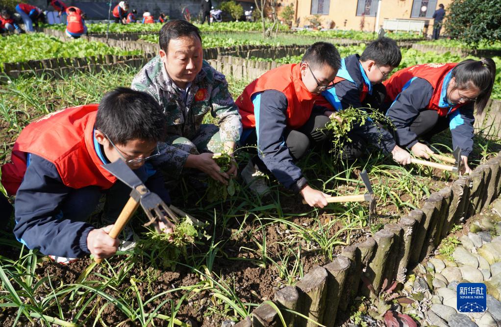 11月10日,在平利县盛丰源现代农业劳动教育研学实践基地内,平利县城关初中8年级18班的同学在菜地内劳动。