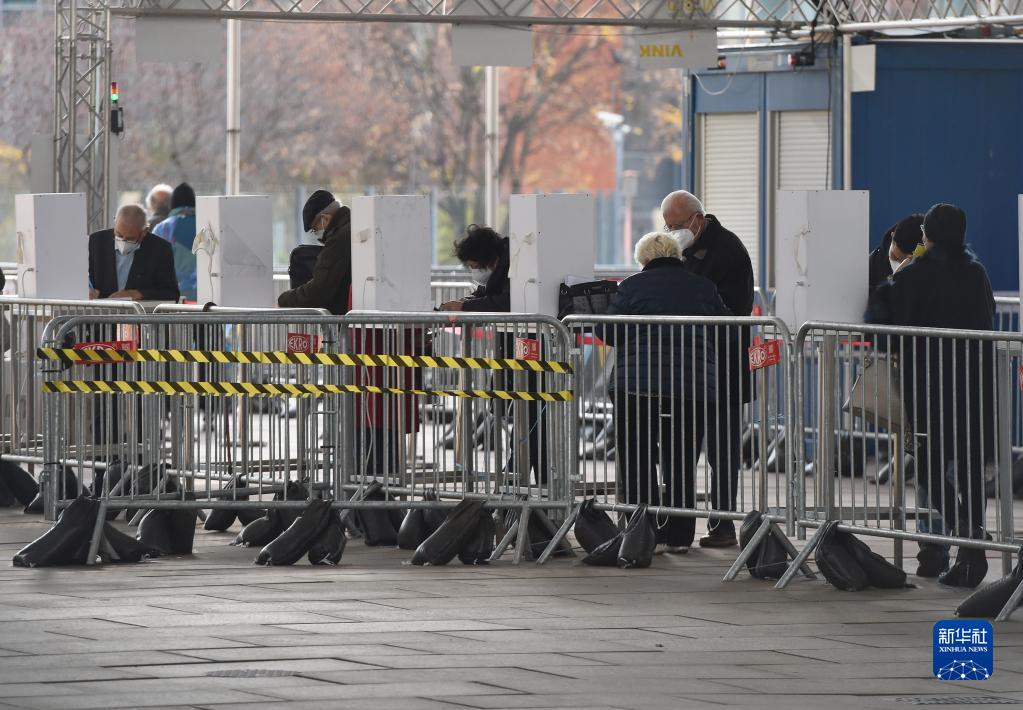11月10日,在奥地利维也纳,市民在一处疫苗接种点前填写接种疫苗信息。