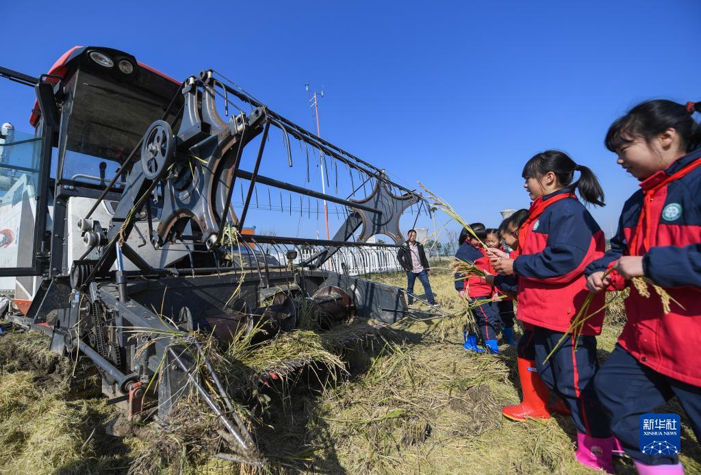 当日,在浙江省湖州市吴兴区道场乡钱山下村粮油合作社的千亩稻田中,湖州市吴兴区城南实验学校的学生们在党员志愿者和老师们的带领下开启了“秋季田间课”的农耕文化体验,了解粮食的来之不易,树立节约粮食的观念。