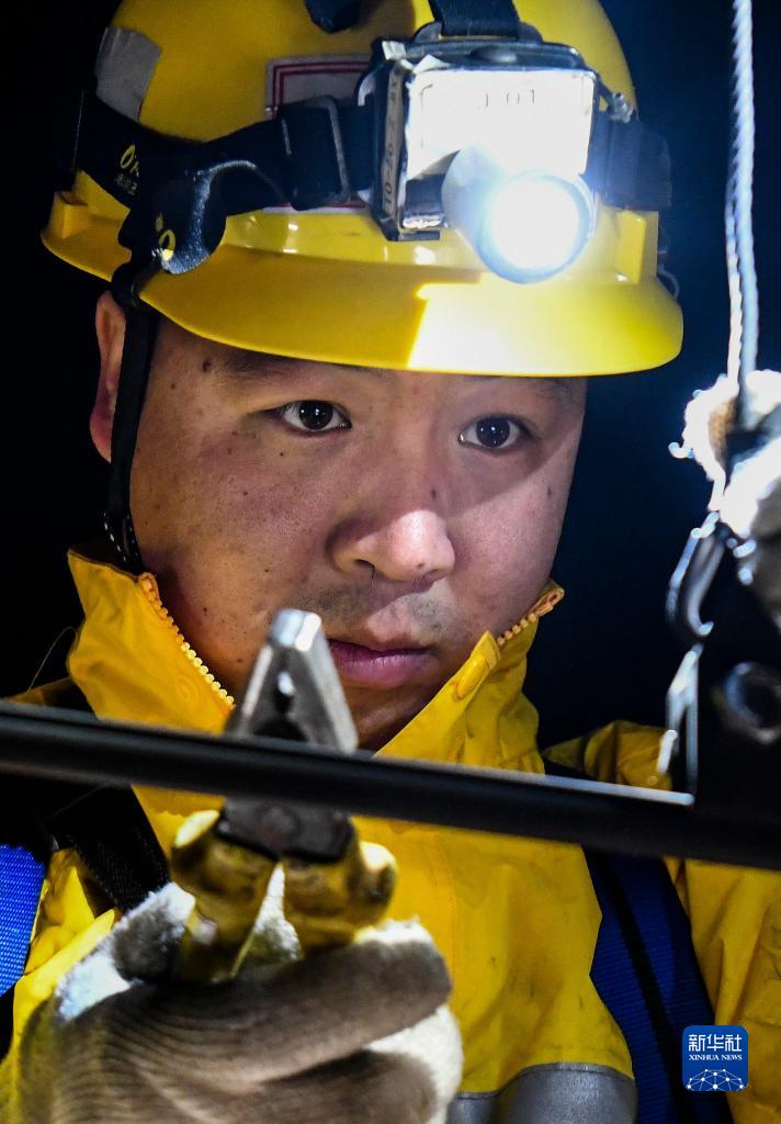 在衡柳线(全州段),一名工人在检查接触线的松紧度(11月10日摄)。