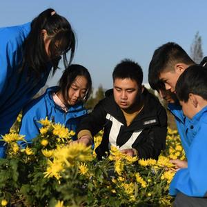 11月11日,在湖州市现代农业技术学校的实训基地,学生在搬运采摘的菊花。