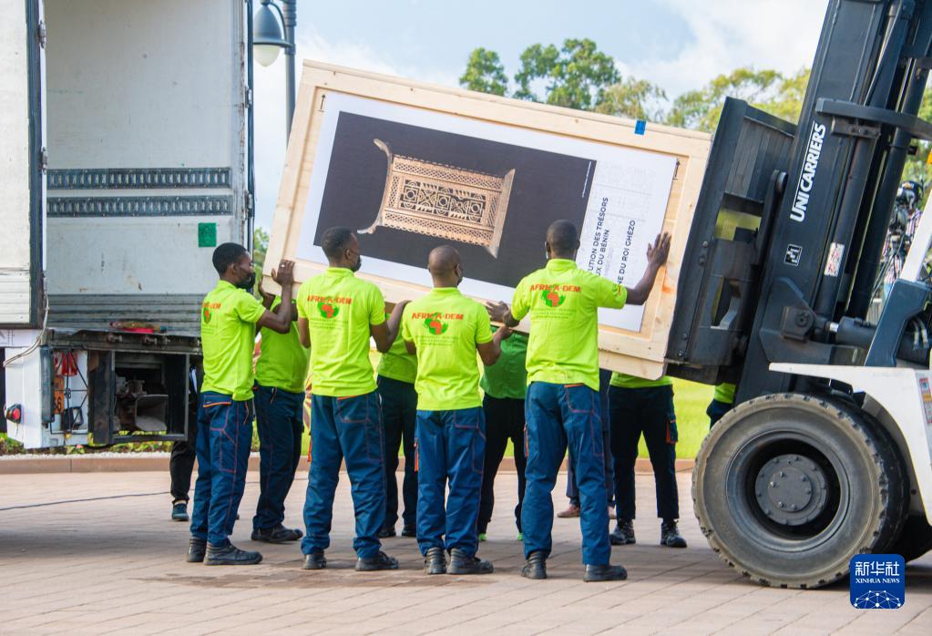 11月10日,工作人员在贝宁科托努机场卸载历史文物。