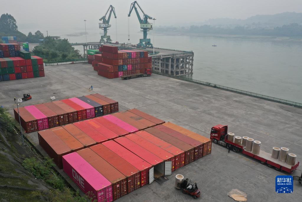 这是11月11日在重庆永川港拍摄的包装纸装卸作业现场(无人机照片)。