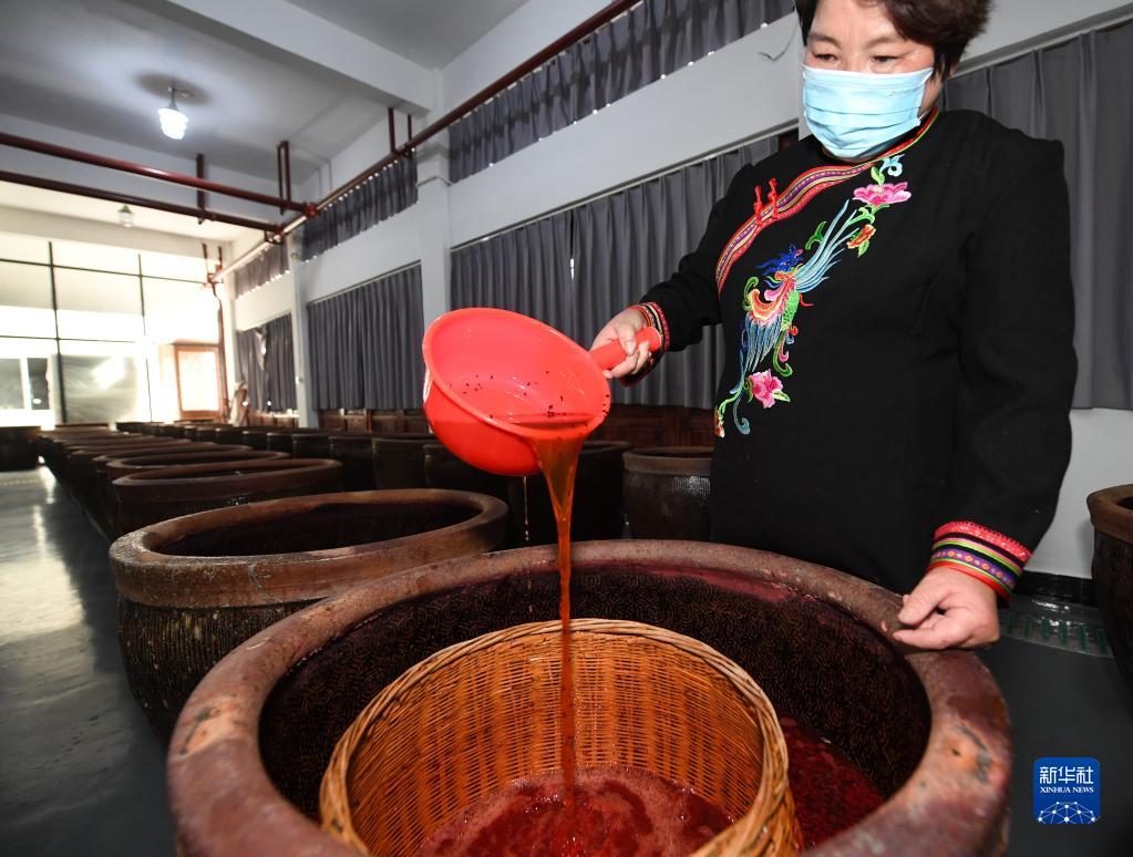 11月12日,在龙峰民族村的一家红曲酒厂内,红曲酒技艺传承人陈凤凤在查看酒料发酵情况。