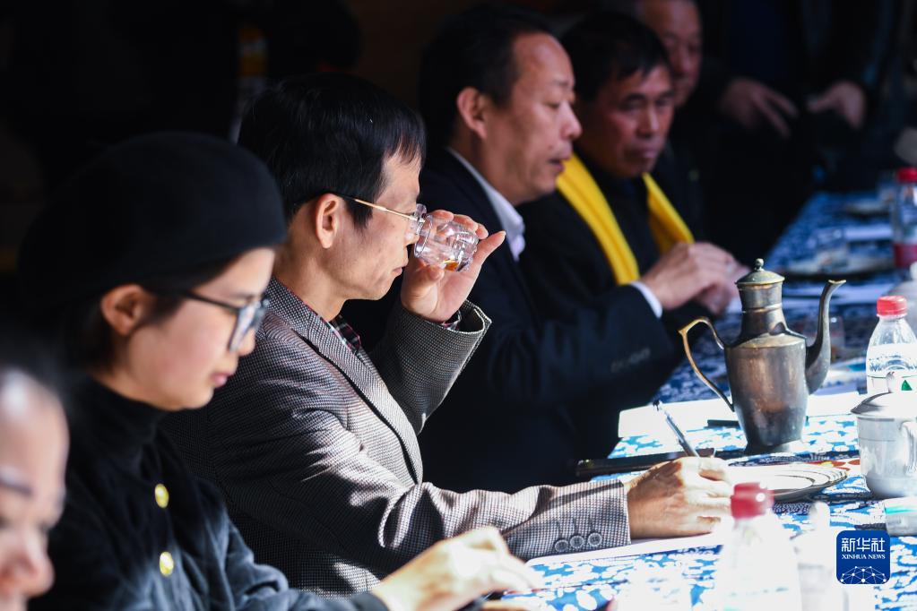 11月12日,在龙峰民族村的红曲酒技艺大赛现场,评委进行红曲酒评选。