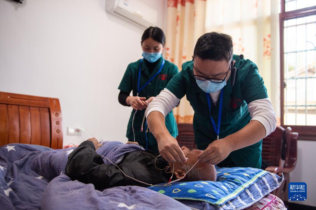 11月12日,在果园镇田汉社区,医务人员彭永(右)为居家老人做针灸治疗。