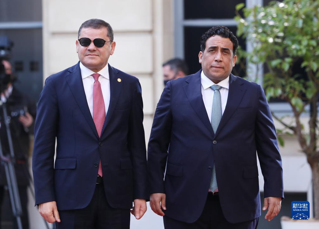11月12日,利比亚总统委员会主席曼菲(右)和利比亚民族团结政府总理德贝巴抵达法国巴黎的峰会会场。