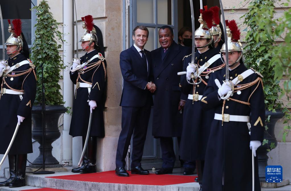 11月12日,在位于法国巴黎的峰会会场,法国总统马克龙(左三)欢迎刚果共和国总统萨苏(左四)。