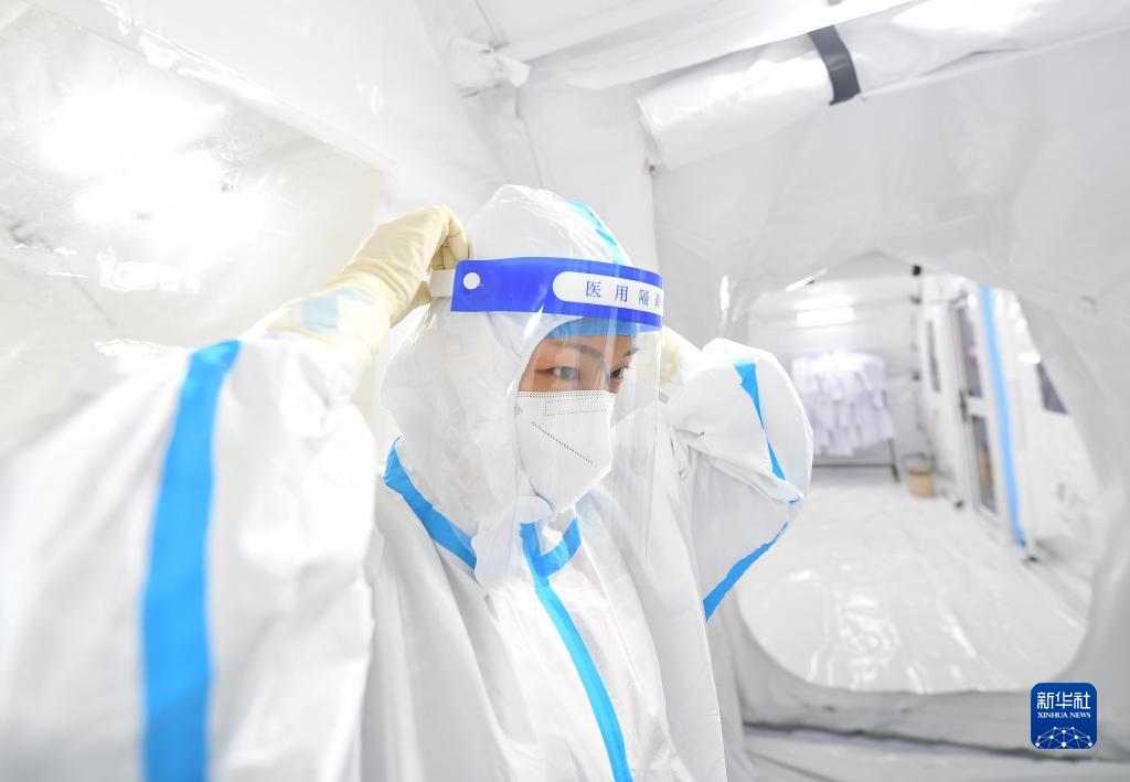 11月12日,工作人员在“猎鹰号”硬气膜实验室走廊穿戴防护装备。