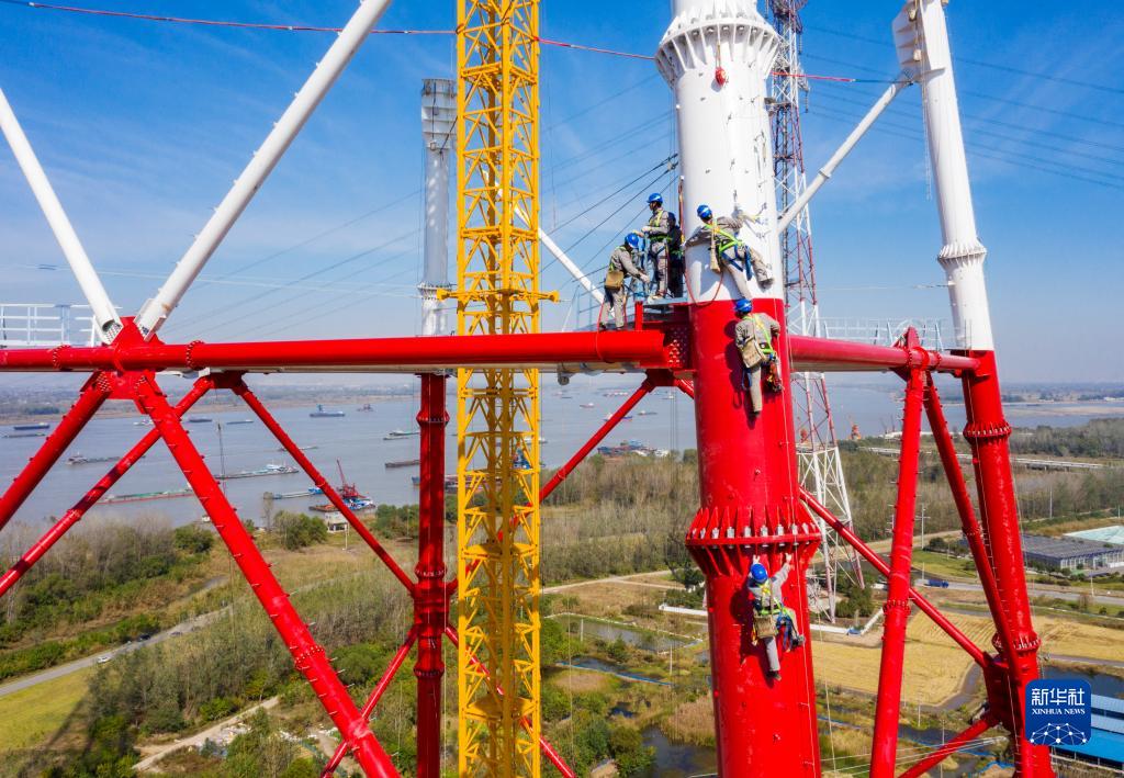 11月11日,安徽送变电工程有限公司施工人员在长江大跨越施工现场攀爬作业(无人机照片)。新华社发(郑贤列摄)