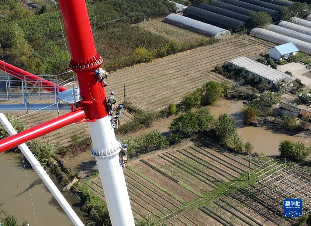 11月11日,安徽送变电工程有限公司施工人员在长江大跨越施工现场攀爬作业(无人机照片)。新华社记者 刘军喜 摄