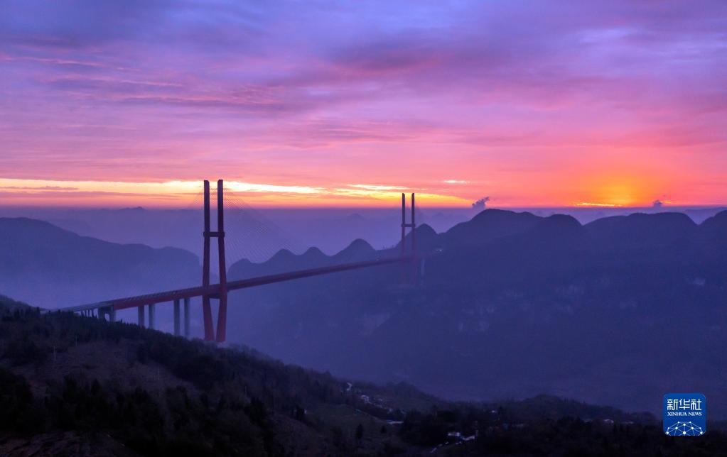 11月13日,在贵州省黔西市拍摄的朝阳下的贵黔高速鸭池河大桥(无人机照片)。