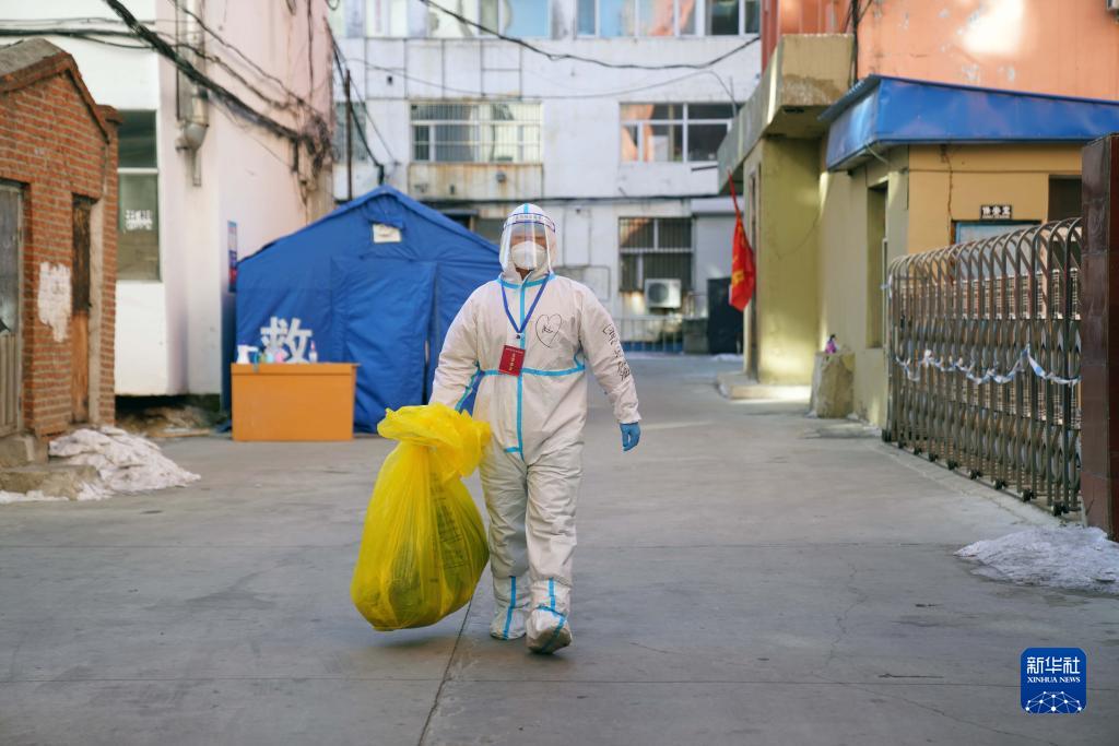 11月12日,在黑河市一小区卡口,2002年出生的志愿者姜博浩为隔离的居民清理垃圾。