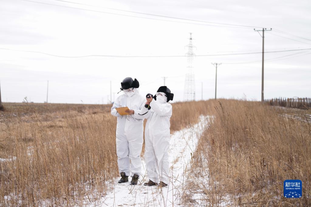 11月11日,在黑河市爱辉区,1994年出生的国网黑河供电公司综合班组电力员工李适明(左)与1996年出生的刘赋在巡检电力设备。