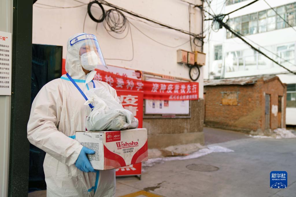 11月12日,在黑河市一小区卡口,2002年出生的志愿者姜博浩准备上门为居民送物资。