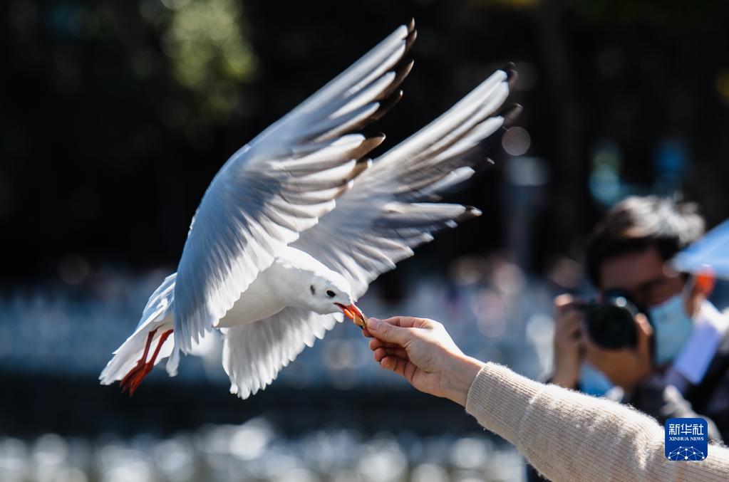 11月11日,市民在昆明翠湖公园投喂红嘴鸥。