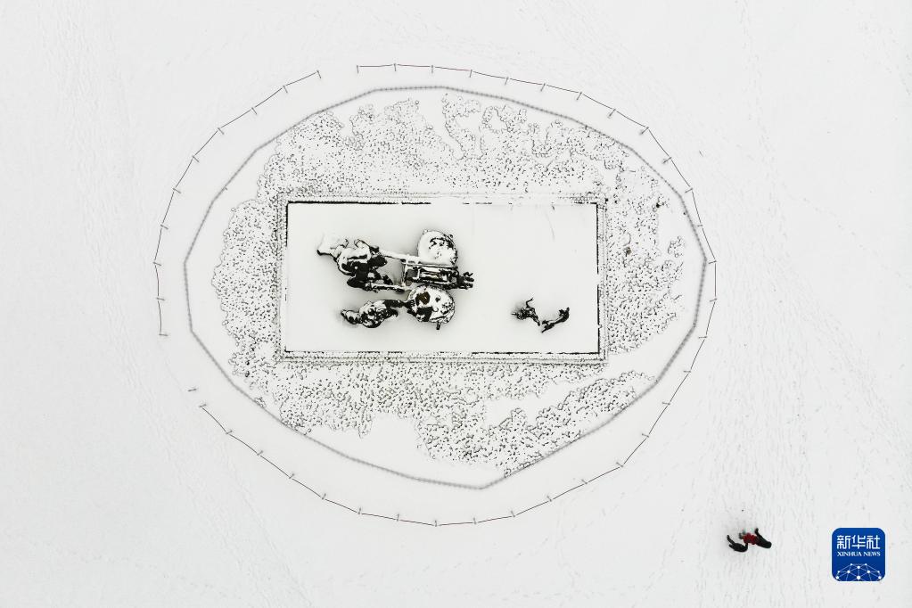 11月8日,市民在哈尔滨市道外区景阳广场上冒雪行进(无人机照片)。
