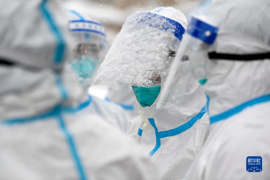 11月6日,在宁夏银川市兴庆区一处中风险小区门前,前来支援的医务人员在风雪中等候分配任务。