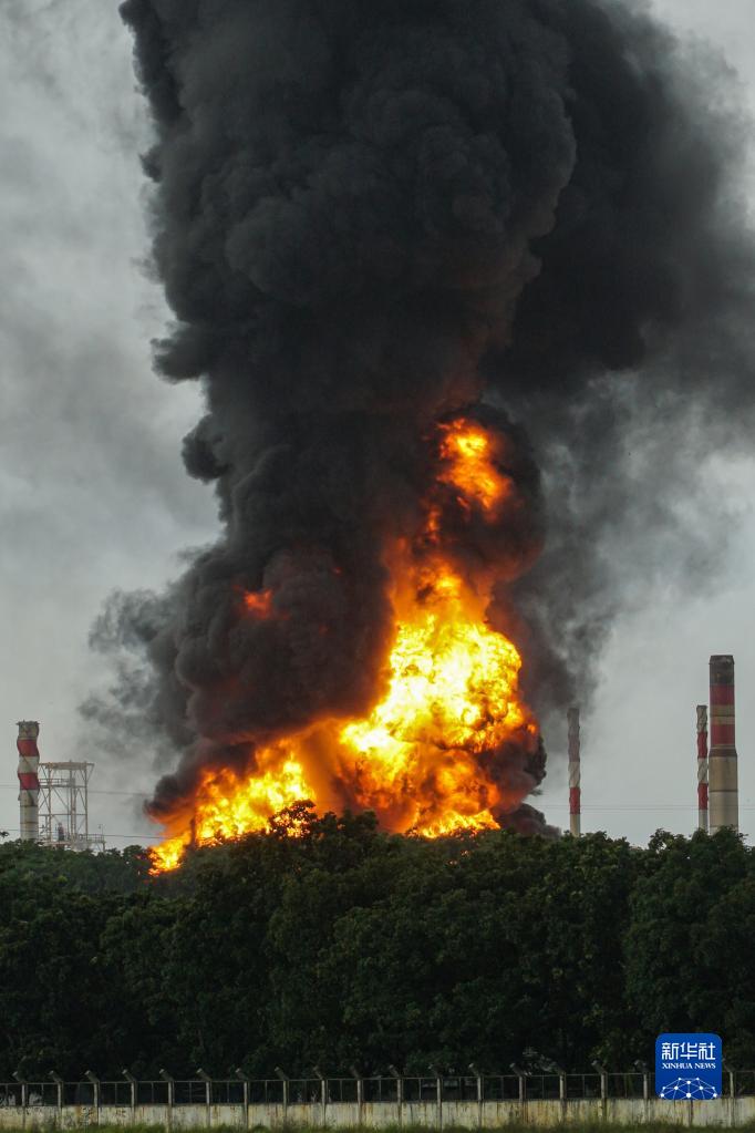 11月14日,在印度尼西亚中爪哇省芝拉扎,发生火灾的炼油厂冒起浓烟。