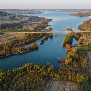 初冬时节,江苏省盱眙县天泉湖色彩斑斓,碧水与红杉相映成趣,构成一幅美丽的冬日生态画卷。