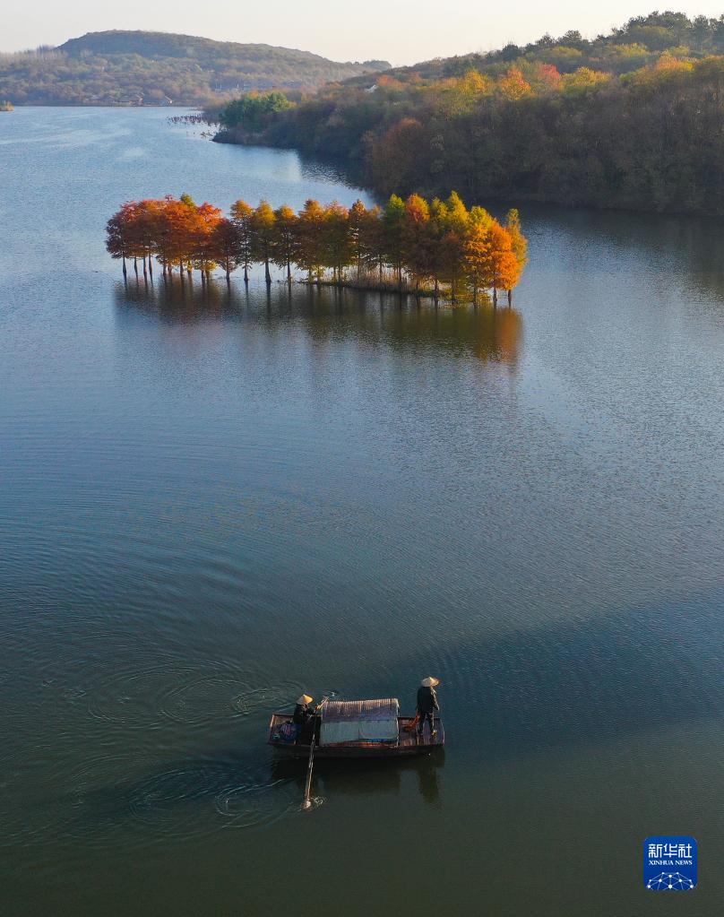 初冬时节,江苏省盱眙县天泉湖色彩斑斓,碧水与红杉相映成趣,构成一幅美丽的冬日生态画卷。