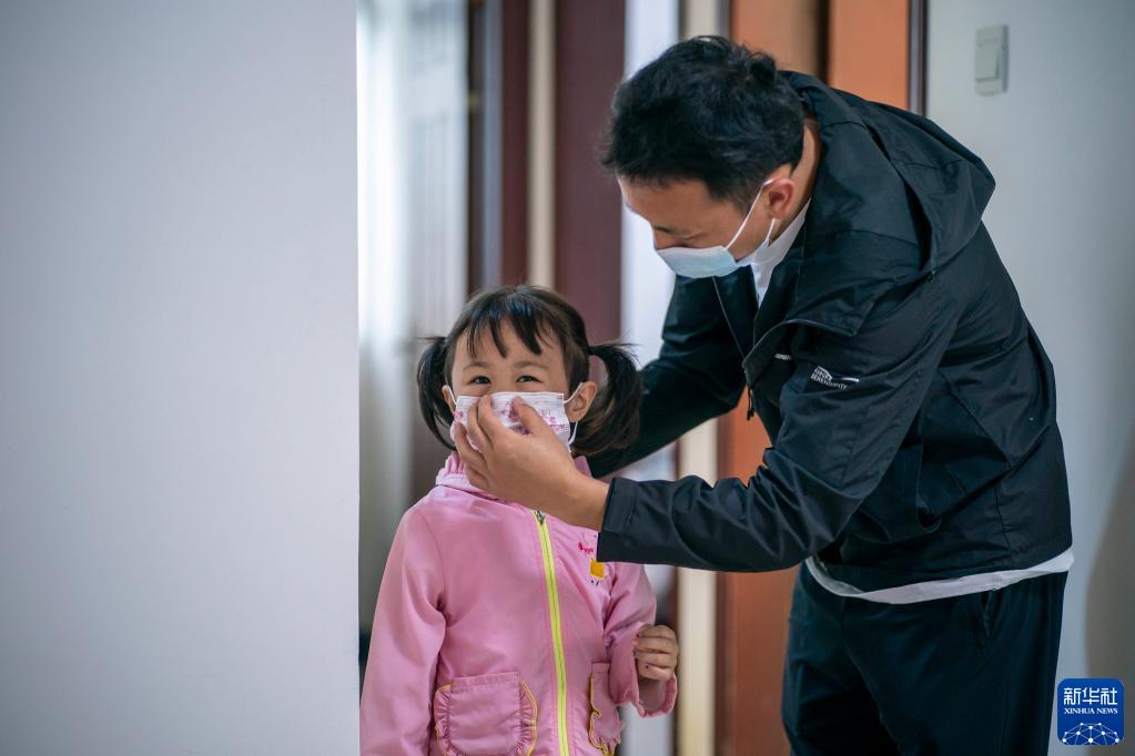 梁照满给女儿戴口罩(11月14日摄)。新华社记者 江文耀 摄