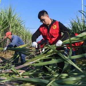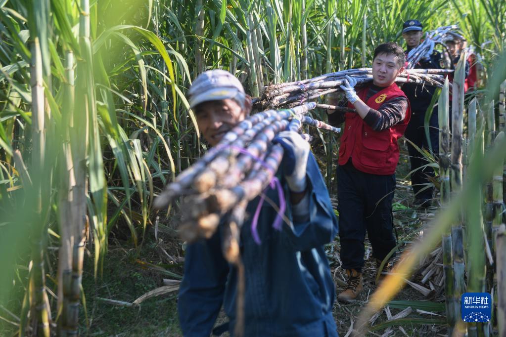 11月16日,汾口镇党员志愿者在宋祁村的甘蔗地里与农户一起搬运甘蔗。