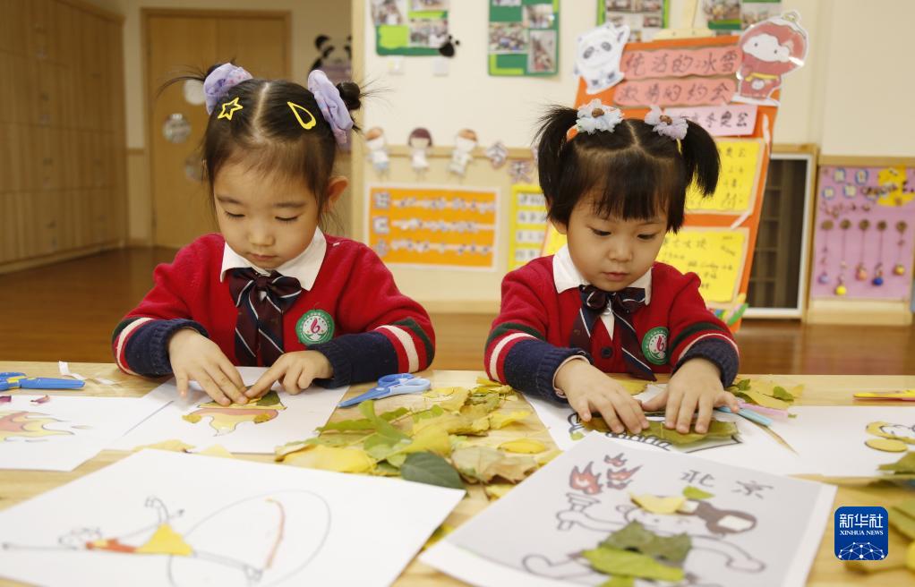 11月16日,邢台市襄都区第六幼儿园小朋友在制作冰雪运动题材树叶画。