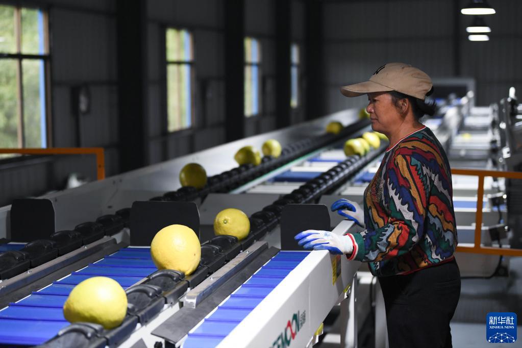 11月16日,在仁化县大桥镇长坝村的粤北果场,工作人员在柚子分拣设备旁忙碌。