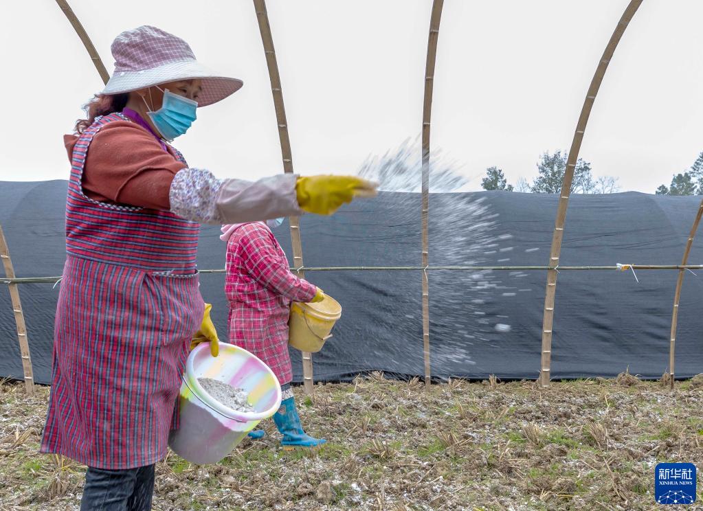 11月15日,村民在黔西市杜鹃街道金钟社区羊肚菌种植基地撒石灰进行土地消毒。
