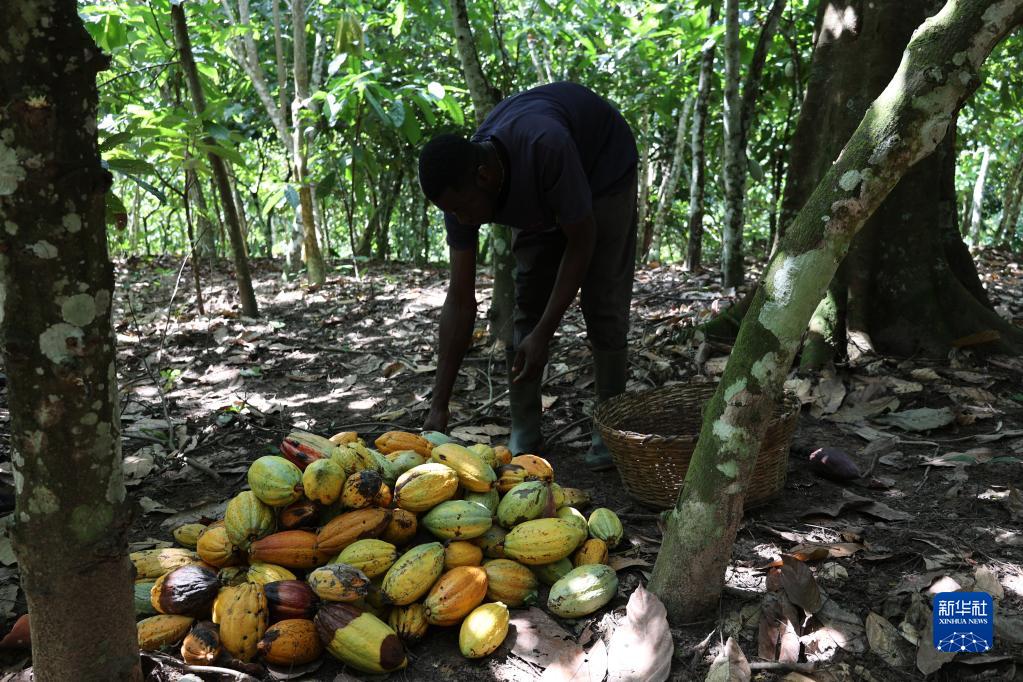 11月15日,在加纳东部省的一处可可种植园,一名种植户在整理可可果实。