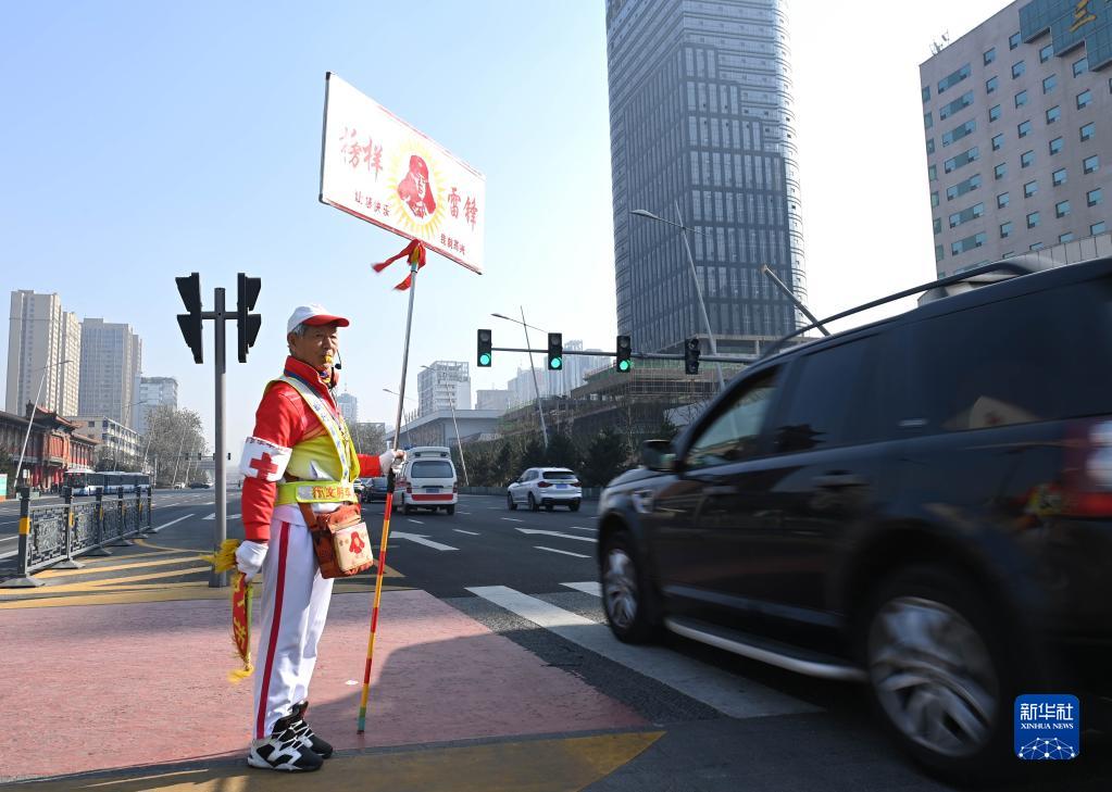 11月17日,在山西省太原市五一广场的路口,马金明在疏导交通。