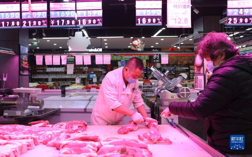 11月18日,一家生鲜超市的售货人员为顾客切分肉品。