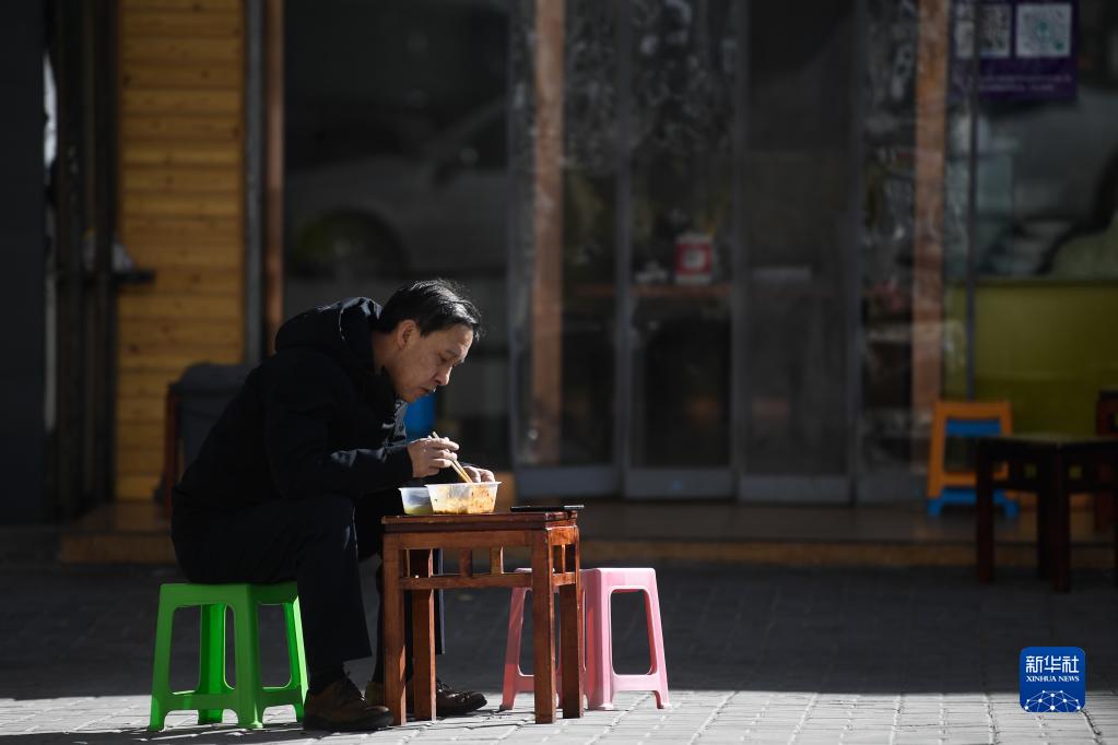 11月18日,一位市民在西宁市城西区一家餐馆外就餐。