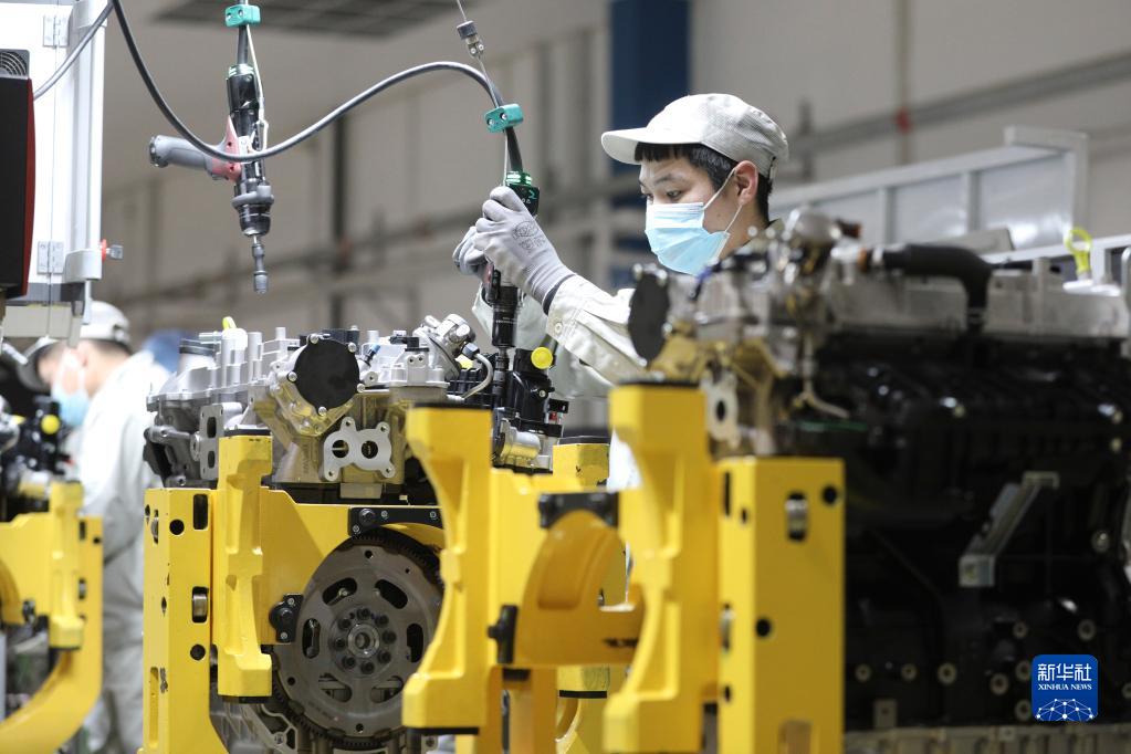11月18日,在哈尔滨一家汽车发动机制造企业,工人在组装发动机。