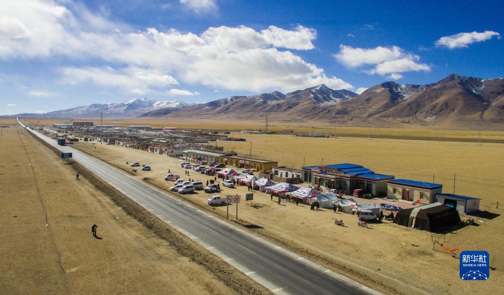 这是在青藏公路旁搭建的那曲县香茂乡畜产品展销会(2017年11月25日摄,无人机照片)。