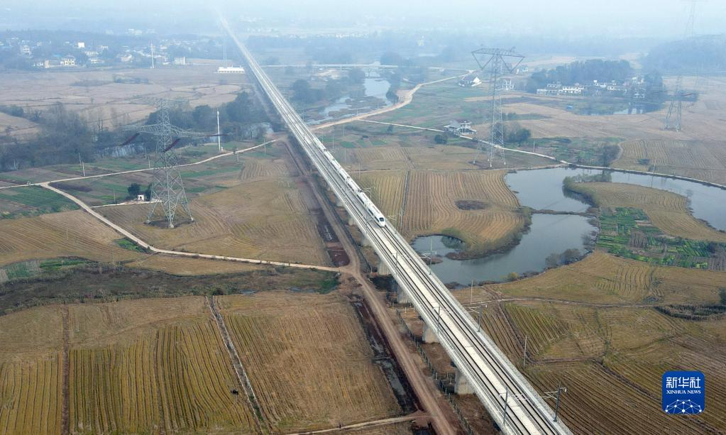 11月19日,运行试验列车行驶在安九高铁安庆至黄梅段(无人机照片)。