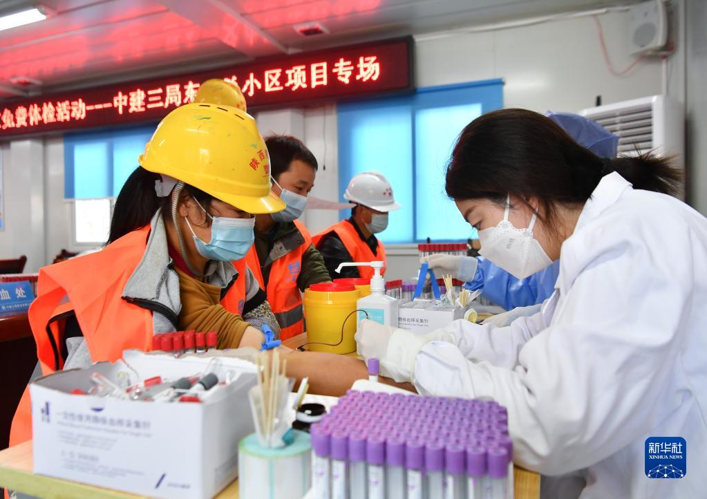 11月19日,在西安市一处安置小区建设项目,中建三局西北公司工人在接受身体检查。