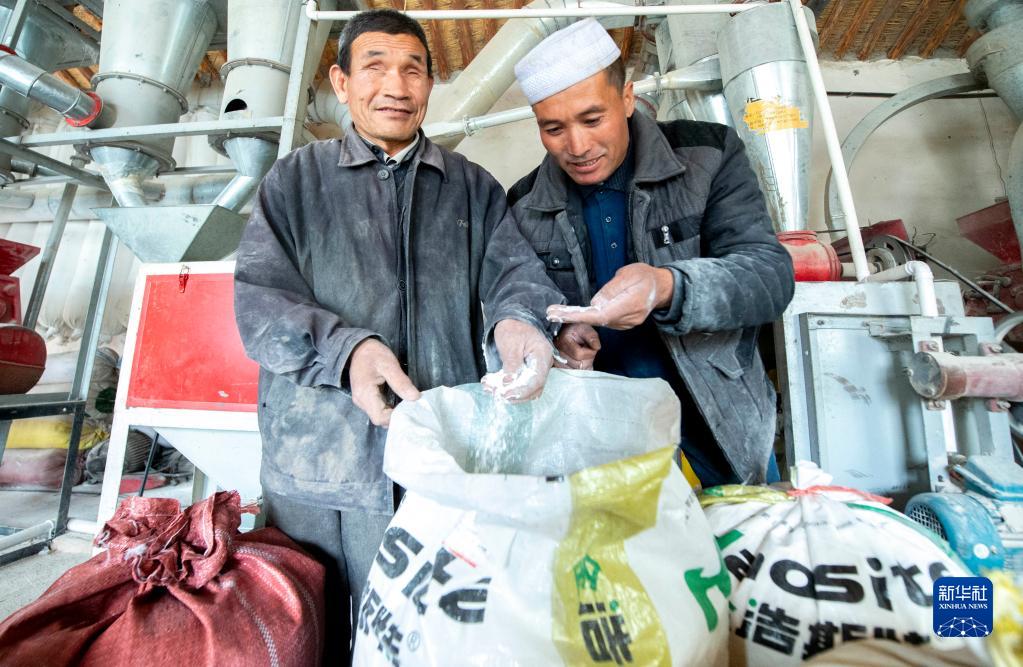 宁夏吴忠市红寺堡区农民马腾俊(左)和前来磨面的当地村民共同检查新磨出的面(2019年10月25日摄)。