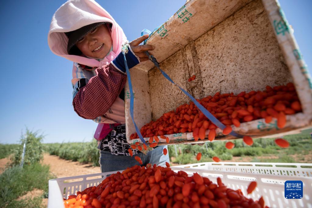 7月1日,在宁夏中宁县玺赞生态枸杞庄园,采摘工准备将采摘的枸杞称重。