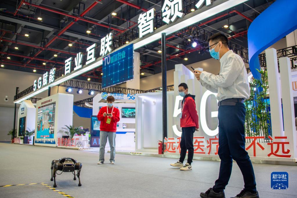 11月20日,参观者在“5G+工业互联网成果展”现场拍摄仿真机器狗。